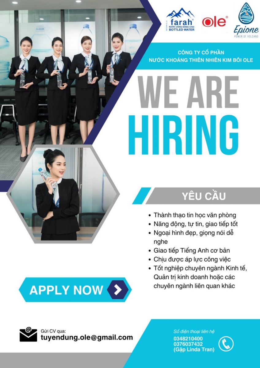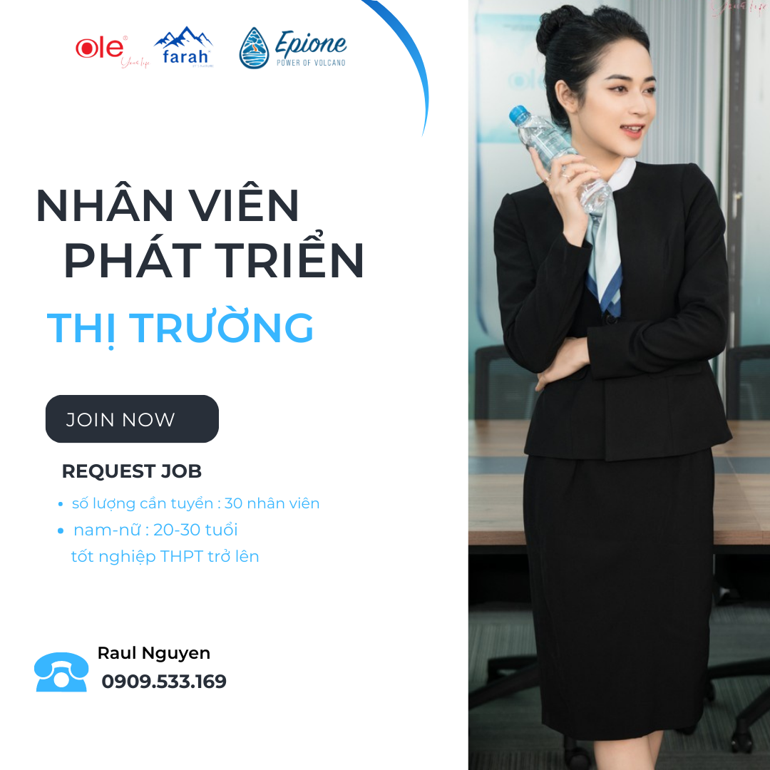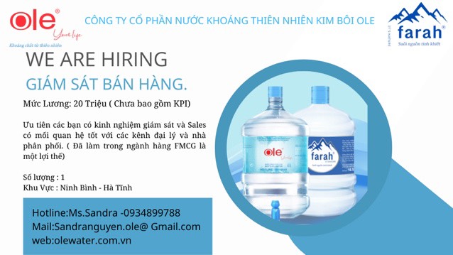 Công ty cổ phần nước khoáng thiên nhiên Kim Bôi Ole tuyển dụng 20 nhân viên bán hàng tại Hà Nội – Lương cơ bản : 7.000.000 – Thưởng vượt KPI – Làm việc trong môi trường chuyên nghiệp – Nhiều cơ hội thăng tiến Add : tòa nhà Plaschem – 562 Nguyễn Văn Cừ…