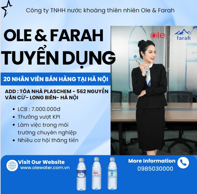 Công ty cổ phần nước khoáng thiên nhiên Kim Bôi Ole tuyển dụng 20 nhân viên bán hàng tại Hà Nội – Lương cơ bản : 7.000.000 – Thưởng vượt KPI – Làm việc trong môi trường chuyên nghiệp – Nhiều cơ hội thăng tiến Add : tòa nhà Plaschem – 562 Nguyễn Văn Cừ…